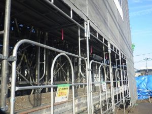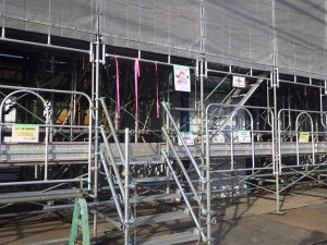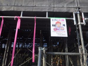 外部足場の枠上部にリボンテープを貼り付け、頭部の接触事故防止の啓発として行っております。